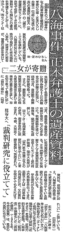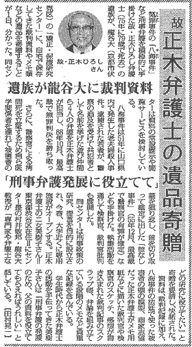 数々の冤罪事件の弁護に取り組まれて名高い故正木ひろし弁護士の遺品が龍谷大学に寄贈され、裁判研究に役立てられるそうです。一昨年の「八海事件50周年・東京集会」の際に、ご遺族のご好意によって展示させていただいた八海事件の模型もその一部に含まれています。 (下右 毎日新聞2003年2月2日・京都版) (下左 毎日新聞2003年2月1日夕刊・大阪版)