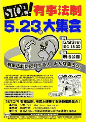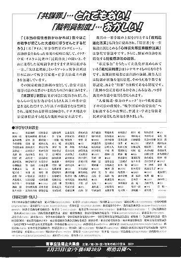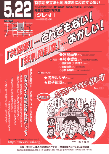 「憲法と人権の日弁連をめざす会(「めざす会」)」が呼びかける「有事治安立法と司法改悪に反対する集い」が、5月22日に「クレオ」(弁護士会館2階・地下鉄霞ヶ関駅下車すぐ)で行われます。この集会の意義は「めざす会」が参加を訴えるビラを読むと一目瞭然です。簡潔明瞭なので、そのまま借用します。 「(本当の犠牲者数がわかれば)我々はこの戦争が起こした大虐殺にぼうぜんとするだろう」(米『タイム』軍事専門家インタビュー)。石油権益をねらった米英の侵略に抗して、イラク・中東・イスラム民衆の「民族自決」の闘いと、それに連帯した反戦闘争がますます世界に拡がる一方、「次は北朝鮮」というブッシュ戦争計画は日本において戦争国家化=有事立法成立の動きを加速しています。 その国家総動員体制の要として、治安立法と刑事司法の改悪がいま私たちの目の前にあります。 「共謀罪」新設法案が国会に提出されました。なんらの実行行為がなくとも2人以上の者が意思を通じただけで、5年以下の懲役または禁固とされ、適用される罪種は500余り。ナチス刑法や治安維持法すら超えた究極の治安立法です。 裁判の一審手続の上限を2年とする「裁判迅速化法案」も国会に提出され、「障害者」を一生施設に閉じこめる「心神喪失等医療観察法案」は参院で審議中です。さらに、解雇の自由を原則化する労働基準法の改悪。 〈市民参加〉をうたって立法化が進められている「裁判員制度」はトンデモナイものになりそうです。裁判員候補者には出頭の強制、被告人には防御が困難な連日出廷、そのうえ過半数で有罪認定、およそ〈陪審〉とは似て非なる制度です。「裁判の公正を妨げるおそれ」ある行為、つまり裁判の報道や批判も禁じられます。 〈人権擁護・権力のチェック〉という戦後憲法下の司法の役割を、〈戦争国家の治安強化〉へと転換するこの攻撃に、弁護士・学者と労働者民衆が連帯した陣地を築きましょう。 なお、この「裁判員制度」ですが、「めざす会ニュース31号(4/21)」によれば、 政府司法制度改革推進本部の事務局がとりまとめた「裁判員制度」のたたき台によれば、有罪・無罪の判断、量刑とも「裁判官と裁判員の合議体の員数の過半数」で決するものとされています。有罪の判決をするのは「犯罪の証明があったとき」すなわち「合理的疑いをいれない程度」に証明されたときでなければならない、という大原則も無視です。しかも、有罪と決まれば、無罪の主張をした裁判員も量刑決定に参加しなければならず、「良心の自由」まで奪われます。 また、「何人も、裁判員に事件に関する偏見を生ぜしめる行為その他の裁判の公正を妨げるおそれのある行為を行ってはならない」とされ、公判中の裁判はもとより、捜査についても批判、評論は一切禁止されます。大衆的な裁判批判運動の結果、無罪を勝ち取った松川事件のようなことは今後は許さないとする制度です。 「裁判員制度」には、刑事司法を改善する契機は全くありません。百害あって一利無し。葬り去るのみです。 ということのようです。念のために付け加えると、「裁判員候補者」は拒否すると罰せられるというのだから〈陪審〉どころか〈有罪儀式の構成員〉でしかありません。まやかし「司法改革」は粉砕あるのみ。 5月22日の集会に参加しましょう。そして、当日の参加者に《6/7富山再審集会》への参加を訴えましょう。