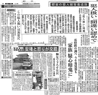長野県飯田市で4月27日に自宅で77歳の女性が殺害されているのが発見され、隣家に住む長女の桜井好子さん(51)が「犯人扱いされた」のです。6月から7月にかけて毎週1回、長いときは午前9時から深夜0時頃まで警察署内で事情聴取と称する取調をうけ、嘘発見器にまでかけられたというのです。さらに、桜井さんの長女が駐在所に連れて行かれ「お母さんに自首を勧めてくれ」などと言われたそうです。真犯人が逮捕された(9月17日)ので事なきを得ましたが、そうでなかったらえん罪事件が増えるところでした。 周知のとおり、長野県警は「松本サリン事件」で河野義行さんを犯人扱いして「反省した」はずなのに、また同じ事を繰り返すところに正体が露呈しています。司法改悪プラスこの警察ではえん罪の絶え間がありません。 |