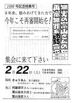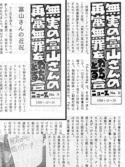 【ニュース2号・3号】 言いたい放題でクレームをつけつづけてきましたが、あらためて一〇〇号への歩みをふりかえると、ニュースにおんぶにだっこだったなというのが正直な感想であり、歴然たる事実でもあります。「無実の富山さんの再審無罪をかちとる会」という名称はすぐきまったものの(なぜこの名称にこだわったのかの説明は別の機会にします)、ニュースは難産だったらしく、やっと出た第一号の紙の質の悪さには落胆したものです。けれども、苦闘を重ねながら着実に成長する様子から執念と熱意は確実に伝わってきて、大いに励まされました。頭があがりません。と、しおらしいことを言いながら、ちっともこりずに言いたい放題をつづけるのが私の私らしいところですから、これからもイジワル爺さんをつづけるつもりです。 随分立派なことを言っています。残念ながら200号までに再審無罪を実現することはできませんでした。しかし、着実に前進してきたし、これからも前進しつづけ、究極目標にたどりつきたいと思います。 |