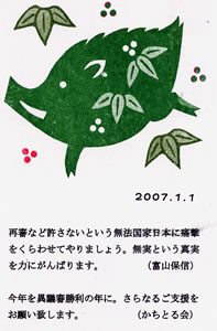 ▼ 会費は月額一口千円です。 ▼ あなたの会費は、再審にむけた運動づくり、再審の裁判費用等に 役立てられます。 ▼ 「かちとる会」では月一回、定例会を開き、再審をかちとるため の話し合いを行っています。また、集会や学習会、現地調 査を行 い、富山さんの無実と再審無罪を訴えています。これらの集まりに もぜひご参加ください。 ▼ カンパのみの送金も大歓迎です。 □ 会費・カンパの振込先 ▼ 郵便振込口座番号 00140-1-1506 無実の富山さんの再審無罪をかちとる会 ▼ 銀行振込 --------------------------------------- 富山裁判の経過・ 1974年10月3日 ※ 現在、高裁第4刑事部に係属中 |