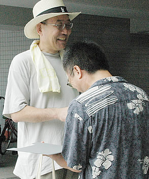 河原井さん・根津さん・佐藤さん 国際連帯ということで、もうひとつ。根津公子さん(東京の教育労働者。03年の「10・23都教委通達」にもとづく「日の丸・君が代」強制に反対して不起立をつづけ、07年3月の卒業式における不起立に対して「停職6ヶ月」の処分。ぜひ、ビデオ・プレスの『君が代不起立』をご覧ください)のたたかいをアメリカNEA(全米教育協会・320万人)の大会で訴えてきた佐藤さんと遭遇したので、根津さん、河原井さん(根津さんとともにたたかう東京の教育労働者、「停職3ヶ月」の処分)とスリー・ショット。反響はすごくて、続々署名が集まったそうです。パンフレット『海を渡った不起立闘争』(労働者学習センター・300円)をご覧ください。