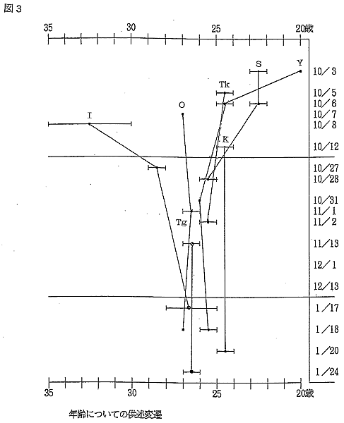 さらに、富山さんが犯人だと言った人達の供述調書を見て見ますと、供述調書上も奇妙なことが起こるわけですね。図3(10頁に掲載)を見てください。指揮者と実際に殴り殺していた実行犯が3人いるということになっていて、その指揮者は富山さんということになっているわけですが、その人の年齢は何歳くらいだったと言っているかを見ますと、一〇月三日の事件の日に間近で見たというYさんは二〇歳くらいだと言っていた。ところが、写真面割りをして、富山さんが浮かび上がってくる。浮かび上がって、富山さんは二六歳です。今はたいへんなおじさんですけども、当時は二六歳だったんです。指揮者として選ばれた人が二六歳だという話が入ってくると、二六歳にどんどんまとまっていくわけです。